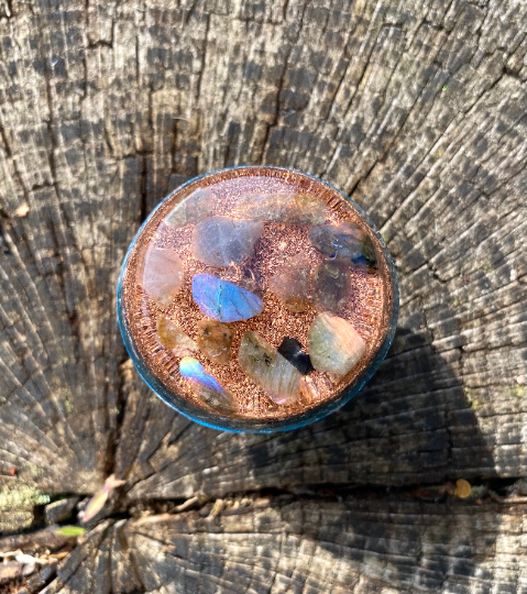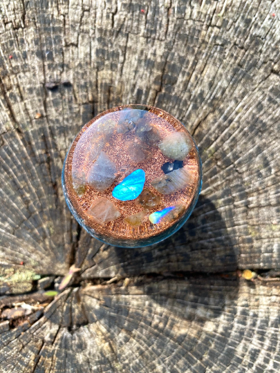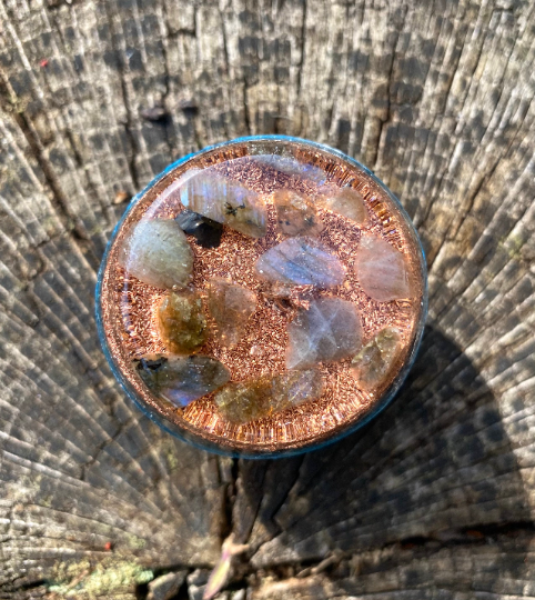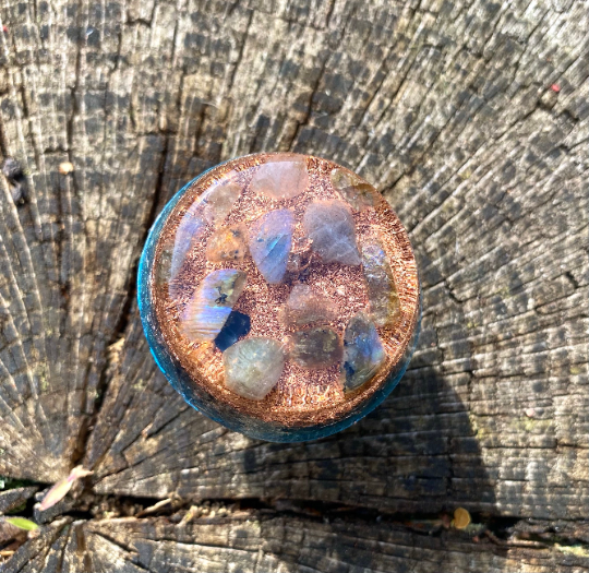 This Orgone cell phone grip was made with Labradorite and Shungite with a copper wire wrapped pointed Clear Quartz, copper bits, and a blue phone grip.